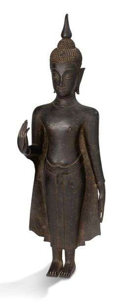 Sujet en bronze de patine noire, représentant le Bouddha debout, les yeux mi-clos, la main droite dans le geste de l'absence de crainte (abhaya mudra).