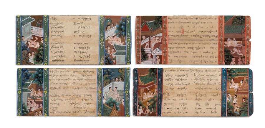 Quatre grandes doubles-pages horizontales de manuscrit à thème érotique sur papier cartonné, une face illustrée de deux bandes latérales verticales animées de scènes érotiques peintes en polychromie.