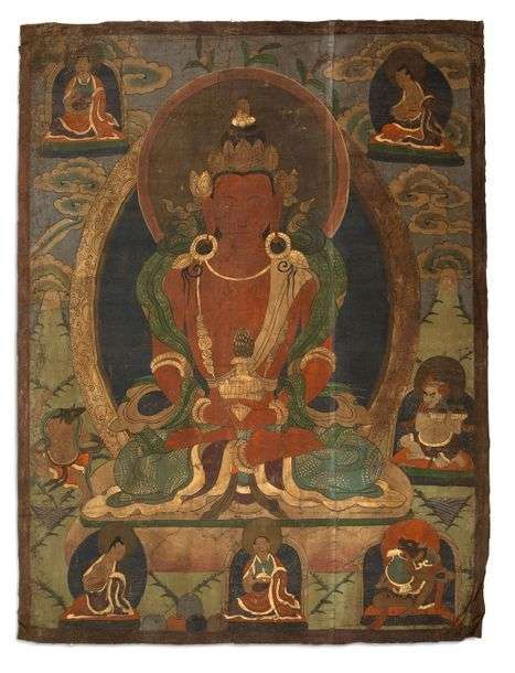 Grand Tangka représentant bodhisattva tenant entre ses deux mains le vase de longue vie. Le grand format de ce tangka a nécessité la réunion de deux toiles ensemble. La présence des syllabes Om Ah