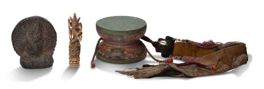Yamantaka et sa shakti| cette forme particulière avec trois faces de chaque côté et trois faces disposées de manière verticale nous permet de rattacher ce tsatsa à l'école Gelugpa (le fondateur de cette école, Tsongkhapa, avait reçu la vision de cette divinité sous forme particulière), et un tambour Damaru en bois.