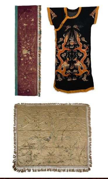 Lot de textiles comprenant, un grand châle carré en soie crème brodée d'oiseaux et fleurs, bordé de franges| un panneau horizontal en soie bordeaux brodée d'oiseaux et fleurs| une robe sans manche en crêpe de soie noire brodée de deux dragons aux fils corail et ocre.