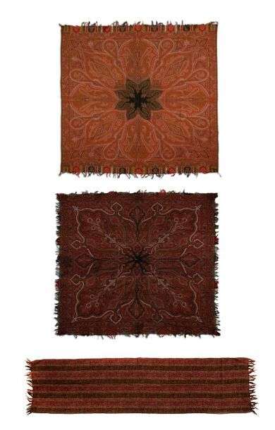 Deux grands panneaux carrés et une étole, en laine tissée de motifs dits «Cachemire », les deux panneaux à décor rayonnant, l'un à dominantes rouge foncé et vert, l'autre à dominantes corail et vert.
