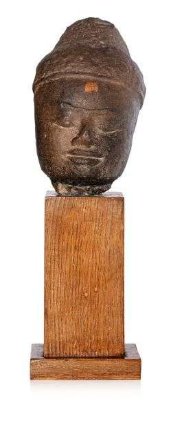 Visage d'une tête de divinité, provenant sans doute d'un relief, en grès de patine par endroits brune, représentant probablement le Bouddha.