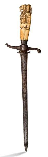 Poignard effilé avec garde en S, le manche en corne sculptée d'un lion et d'un cheval entrelacés, avec inscription 1768 et initiales I S B.