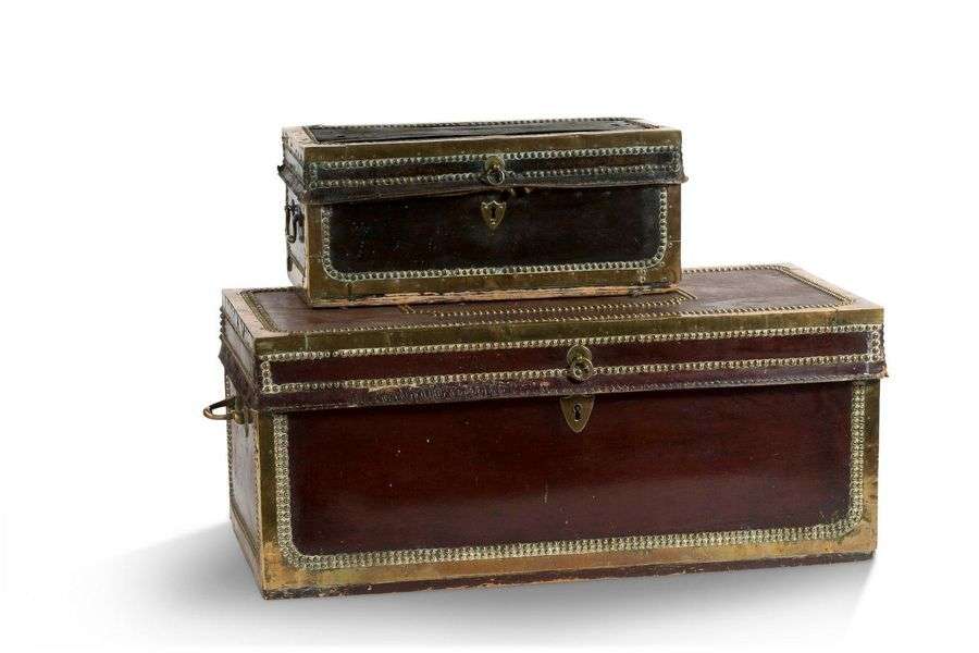 Réunion de deux coffres en cuir marron clouté de forme rectangulaire.