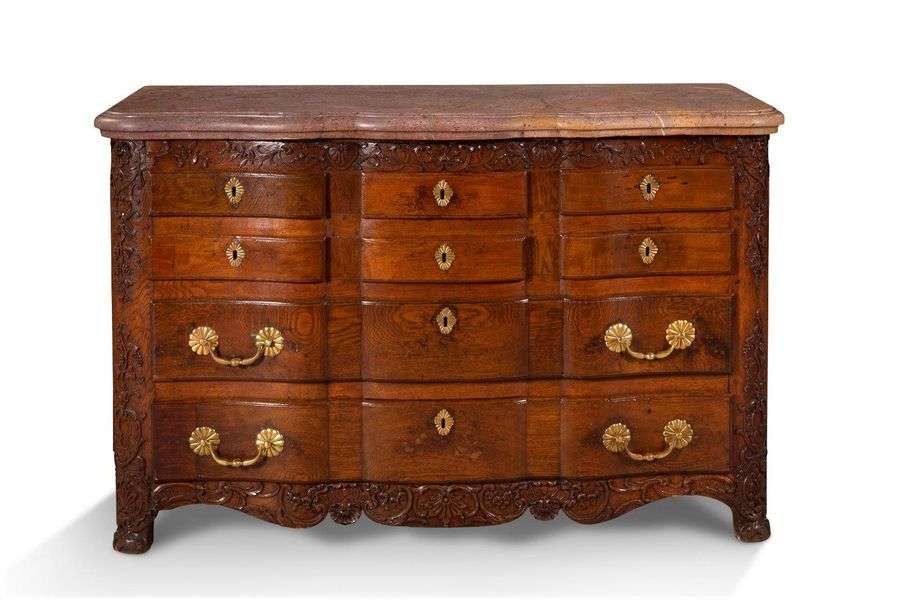 Importante commode de forme légèrement mouvementée en façade. Chêne mouluré et sculpté de coquilles, entrelacs et rinceaux feuillagés. Elle ouvre en façade par huit tiroirs sur quatre rangs. Garniture de bronze doré. Plateau de marbre rose
