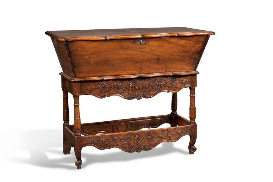 Pétrin en noyer mouluré et sculpté de branches fleuries et médaillon au double coeur. Piètement formé de quatre montants en bois tourné réunis en partie inférieure par une ceinture également sculptée de fleurs.