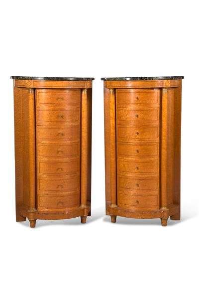 Paire de semainiers de forme demi-lune en placage d'érable moucheté et filets géométriques de palissandre. Ils ouvrent en façade par sept tiroirs flanqués de colones doriques détachées baguées de laiton doré. Plateau de marbre vert de mer