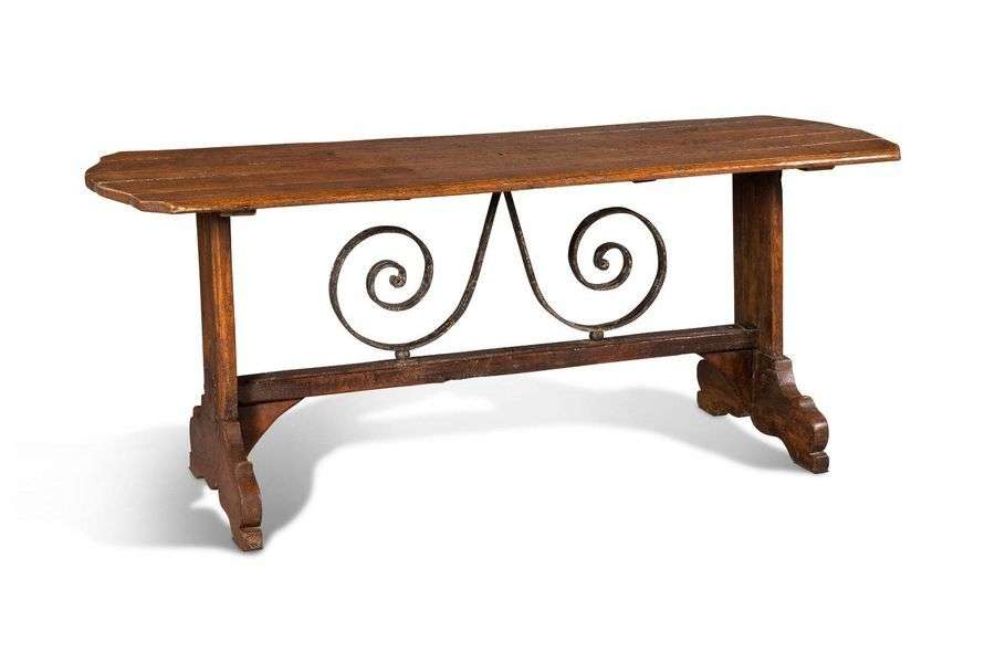 Table de forme rectangulaire en chêne mouluré reposant sur deux montants réunis par une barre d'entretoise surmonté d'un motif de double enroulement en fer forgé.