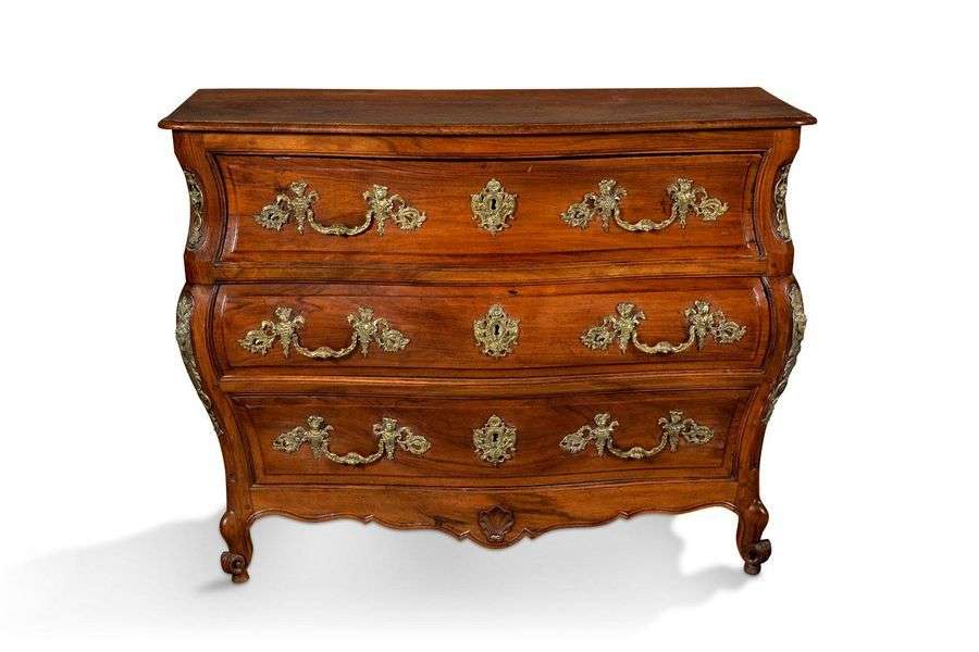 Commode de forme tombeau en noyer naturel mouluré ouvrant par trois tiroirs. Poignées de tirages et chutes en bronze ciselé à décor d'espagnolettes. Elle repose sur quatre pieds en enroulements.