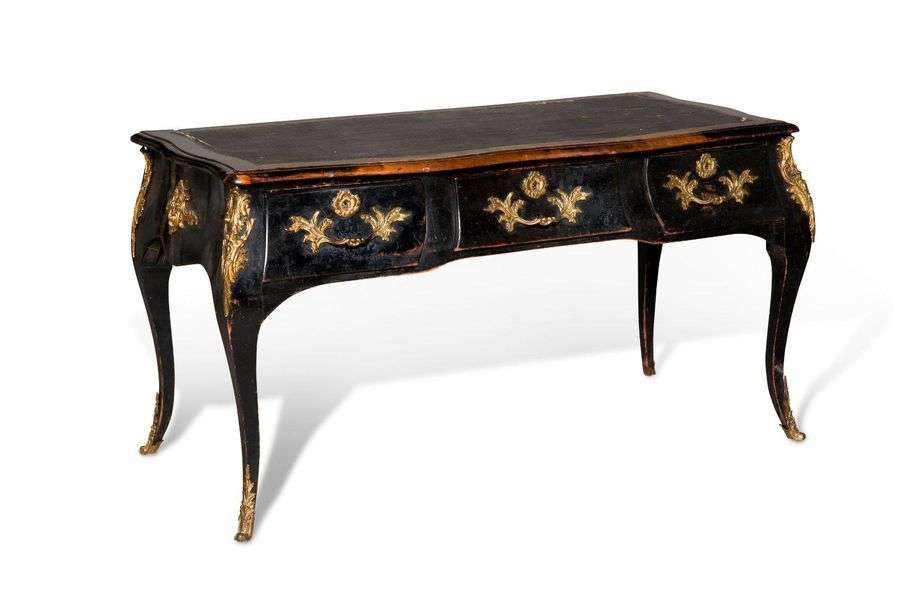 Bureau en noyer patiné noir de forme mouvementée ouvrant en ceinture par trois tiroirs. Il repose sur quatre pieds également de forme galbée. Belle ornementation de bronzes ciselés et dorés à décor de feuillages au niveau des poignées de tirage, entrées de serrure et sabots. Dessus de maroquin noir