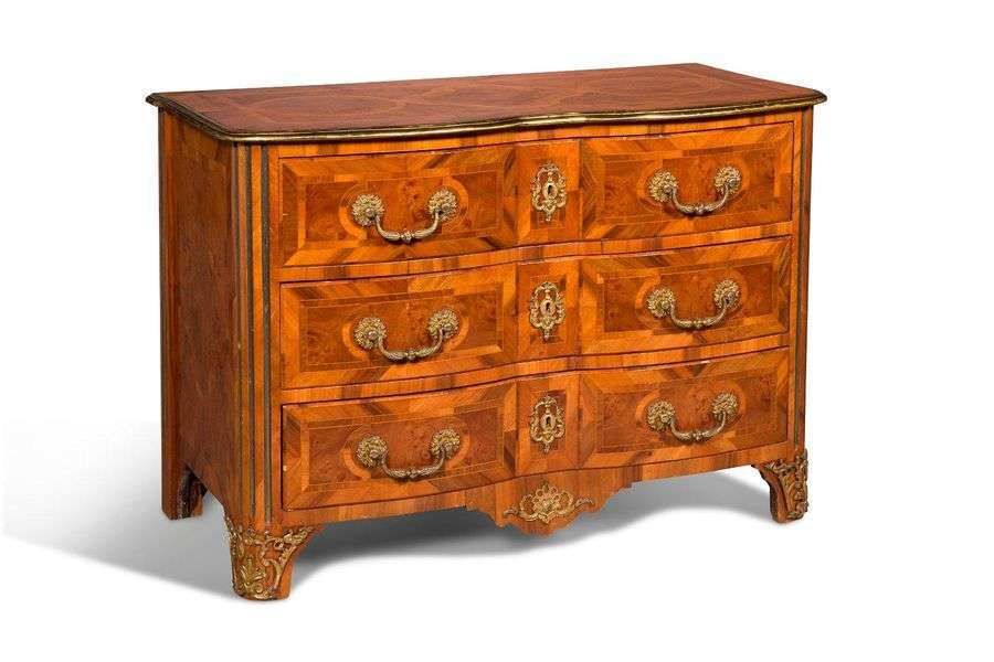 Commode à facade galbée en placage en frisage de bois variés à décor géométrique. Elle ouvre en façade par trois tiroirs sur trois rangs. Le plateau ceint d'une lingotière de laiton, et les panneaux latéraux sont ornés d'un décor géométrique. Les montants arrondis à cannelures sont foncés de laiton.