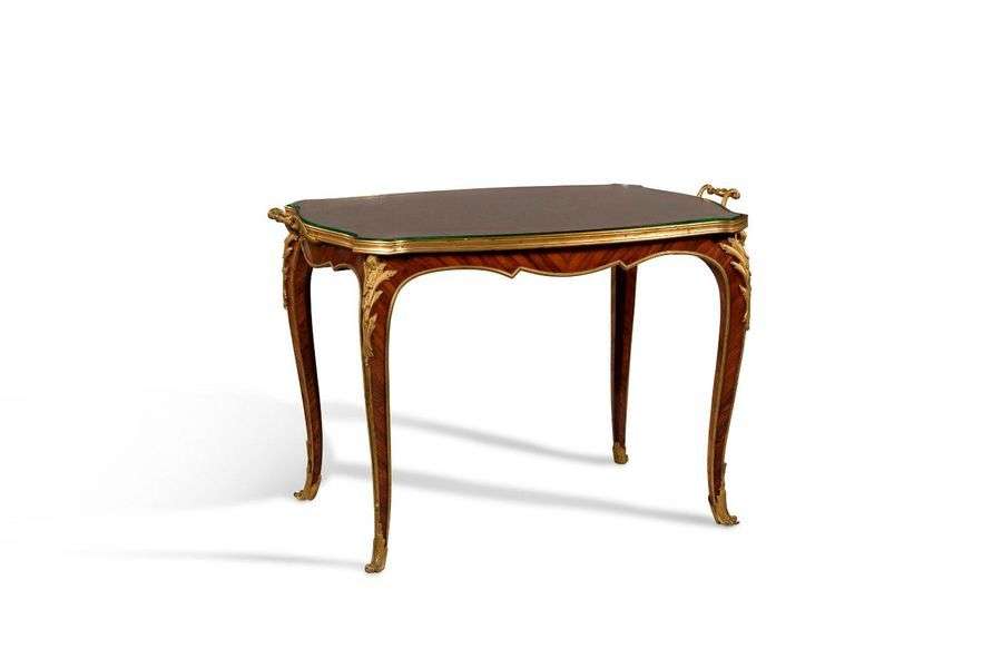 Table à thé en placage de palissandre reposant sur quatre pieds cambrés Le plateau de forme mouvementée, est ceint d'une lingotière de laiton et présente une marqueterie à décor losangé. Chutes, filets et sabots en bronze ciselé de forme feuillagée