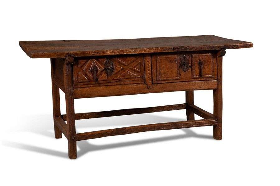 Table en chêne mouluré et sculpté ouvrant en ceinture par deux tiroirs à serrures et prises de tirage en fer forgé. Les pieds réunis par une entretoise.