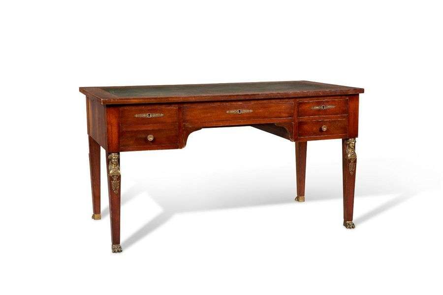 Bureau en acajou et placage d'acajou ouvrant par cinq tiroirs dont trois en ceinture. Chaque pied, de forme gaine est formé en partie supérieure de bustes de cariatides, de palmettes d'appliques, et se termine par des pieds griffes. Tirettes latérales. Plateau gainé de cuir vert
