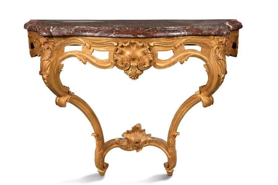 Console en bois mouluré sculpté et doré, de forme mouvementée. Ceinture ajourée, à décor d'une coquilles reposant sur deux pieds feuillagés réunis par une entretoise.