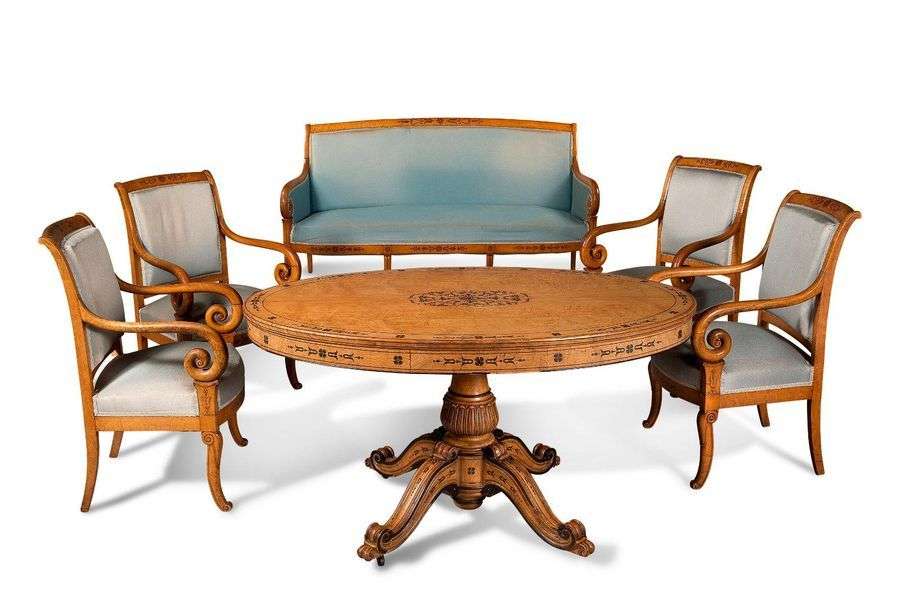 Très bel ensemble de mobilier en placage d'érable moucheté incrusté de rinceaux fleuris et rosaces en palissandre composé d' un grand guéridon, de trois tables à jeu, de six fauteuils à accotoirs en enroulements, de quatre chaises à dossier gondole, deux chaises à dossier à barreau, une table demi-lune, une console avec plateau de marbre gris veiné blanc, un lit de repos et une banquette.