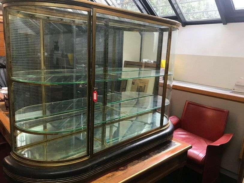 Vitrine de forme demi lune en bois et laiton à trois étagères foncées de m