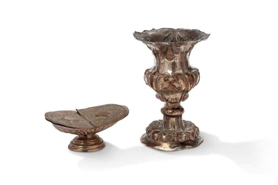 Grand calice de forme balustre en métal argenté repoussé. La panse de forme grodonnée est ornée d'un décor fleurdelysé et de volutes et agrafes. Ellle repose sur un piédouche.