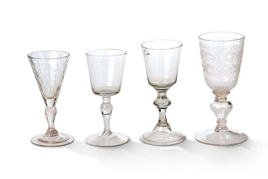 - Deux verres à pied, l'un gravé à la roue de motif floraux, l'autre en verre taillé.