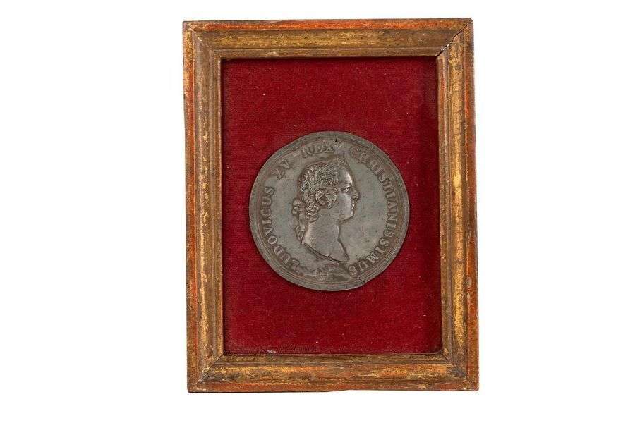 Médaille en métal orné d'un profil de Louis XV lauré, il est inscrit sur le pourtour : LUDOVCUS XV REX CHRISTIANISSIMUS