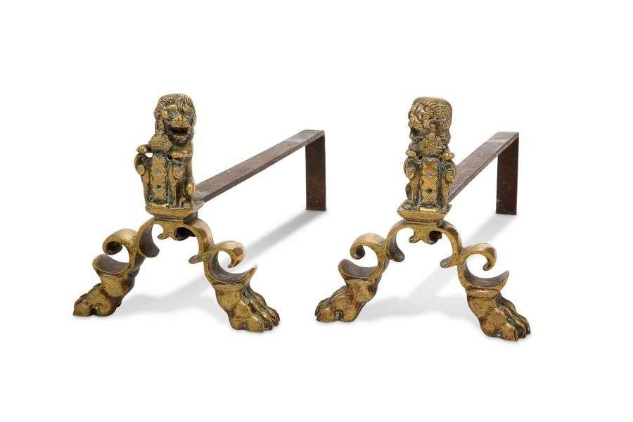 Paire de chenets en bronze ciselé et doré ornés de lions debouts tenant des armes, reposant sur des pattes de lion.