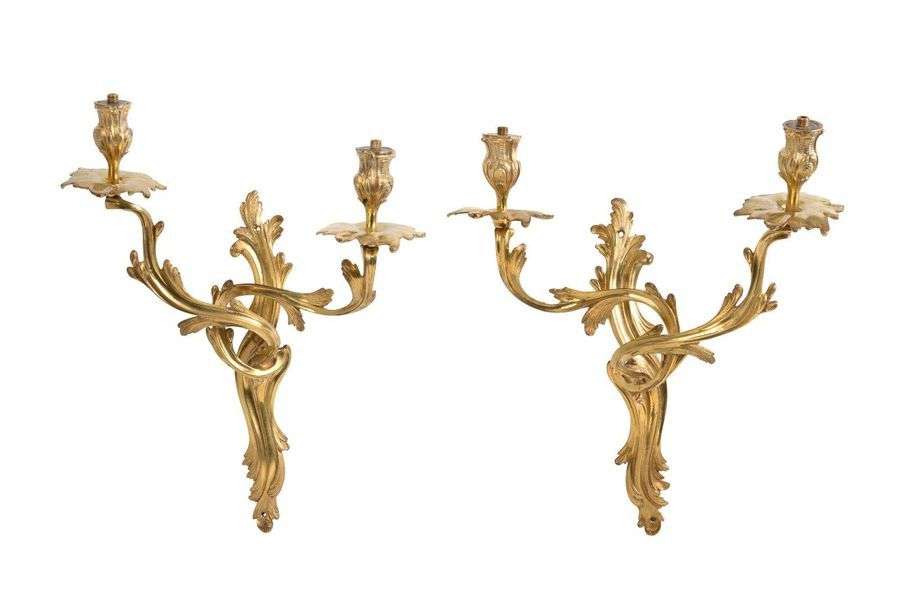 Paire d'appliques en bronze ciselé et doré à deux bras de lumière à décor