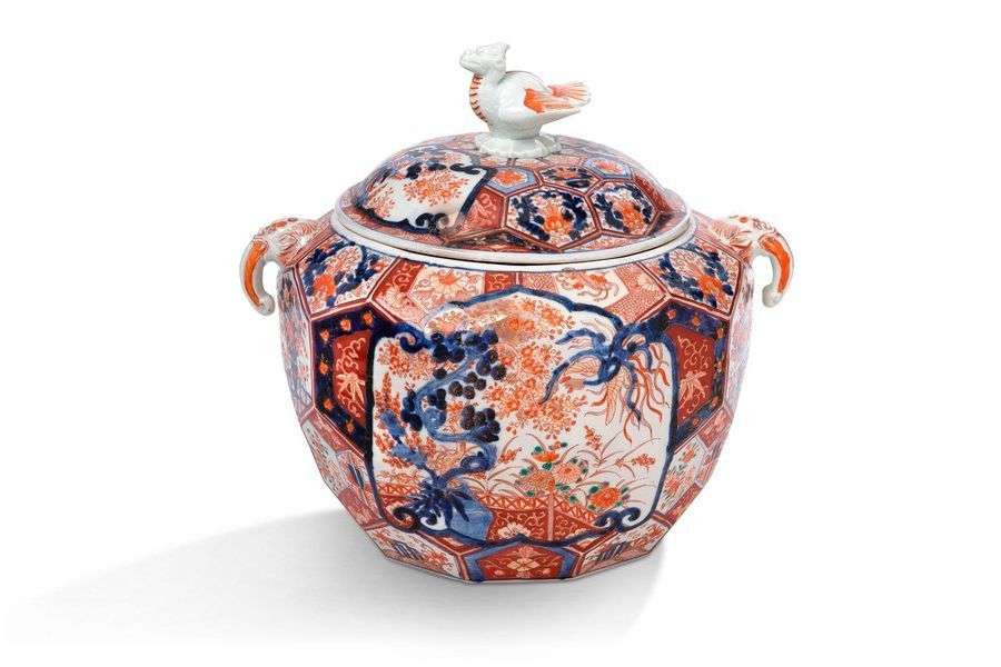 Grande terrine couverte en porcelaine à décor Imari japonais d'arbres en f