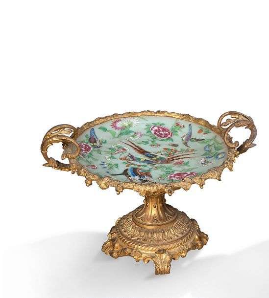 Paire de coupe en cuivre émaillé à décor dans le goût de la Famille verte : fleurs, papillons et oiseaux