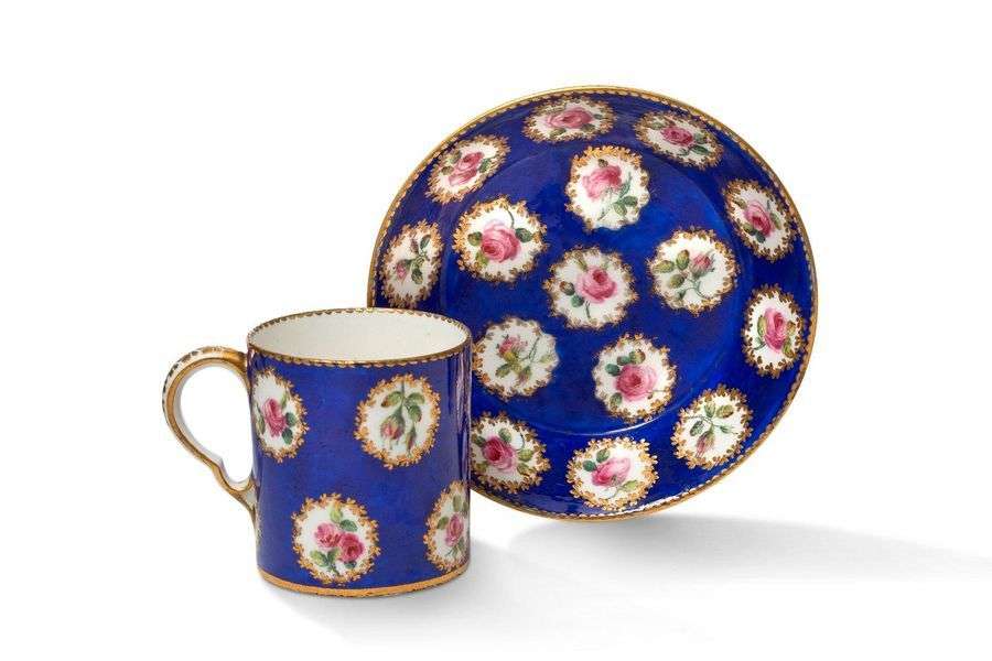 Gobelet litron et sa soucoupe en porcelaine tendre. Décor polychrome de roses cernées de feuillages et ehauts d'or. Fond "bleu nouveau"