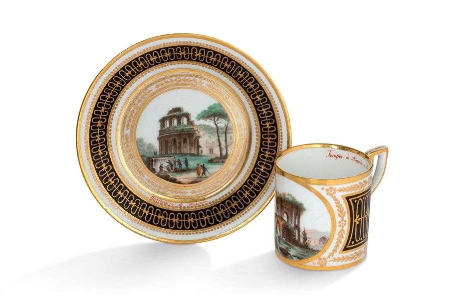 NAPLES. Tasse Litron en porcelaine émaillée polychrome à décor du Temple de Diane. Soucoupe ornée d'un décor de rangs perlés et de feuilles de lauriers rehaussés à l'or sur fond noir.
