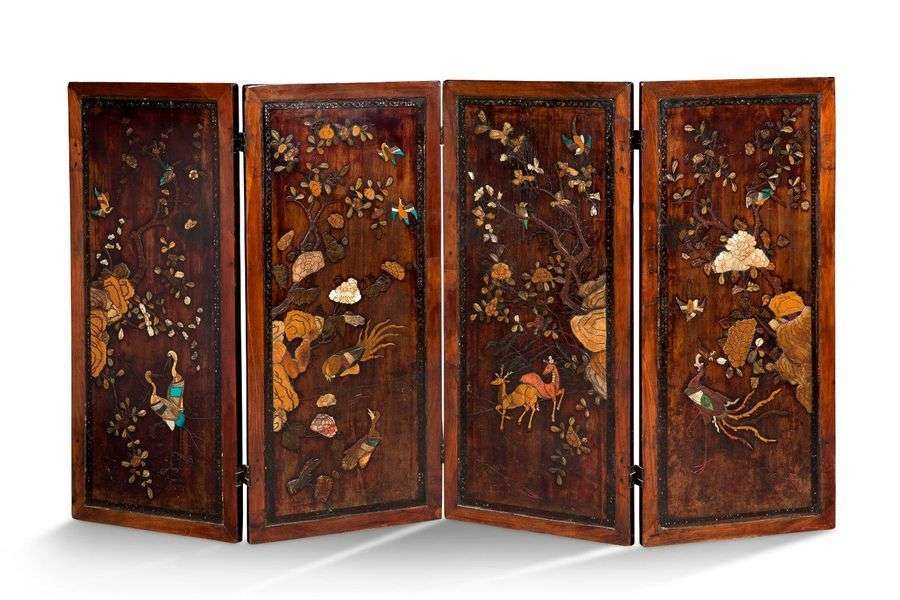 Paravent à quatre panneaux incrusté de nacre et de bois variés à décor de daims, grues et arbres en fleurs