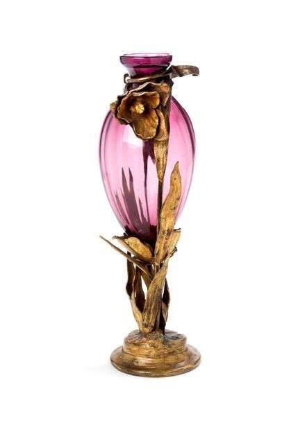 Vase en verre mauve en forme de bouton de fleur et monture en bronze cisel