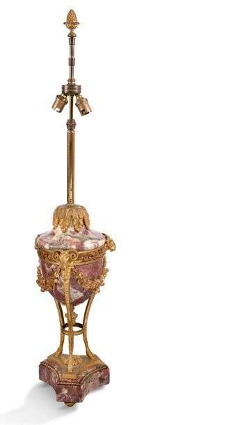 Suite de deux pieds de lampes en marbre rose et bronze ciselé