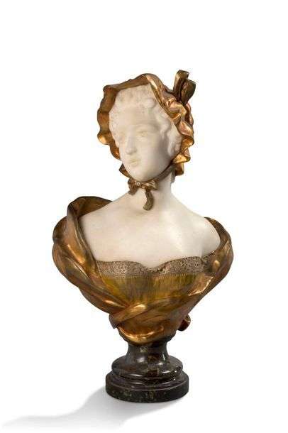 Buste de jeune femme au bonnet en marbre blanc et bronze doré reposant sur