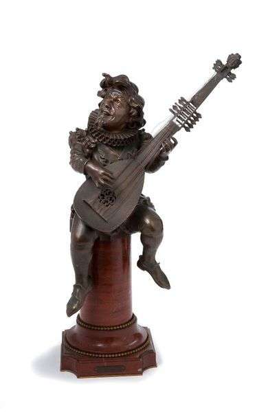 Epreuve en bronze à patine brune reposant sur un socle en marbre rouge, ceint de deux frises de perles. Portant l'inscription "Sérénade au bouffron par V. Aimone, Salon des Beaux Arts"