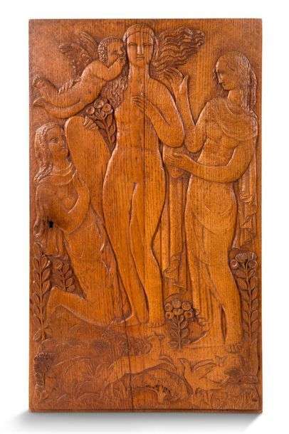 Panneau de chêne sculpté en bas-relief d'une scène représentant Venus et l'amour dans un paysage idyllique.