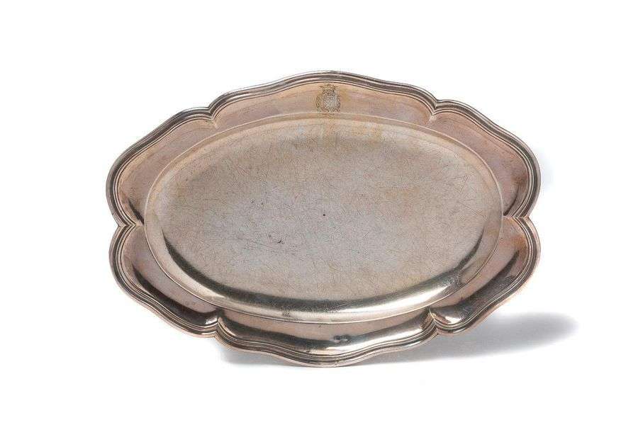 Plat ovale en argent modèle filet contour à décor gravé d'armoiries, de gueules au sautoir d'argent, au chef d'argent chargé de trois étoiles à cinq branches, surmontées d'une couronne de marquis.