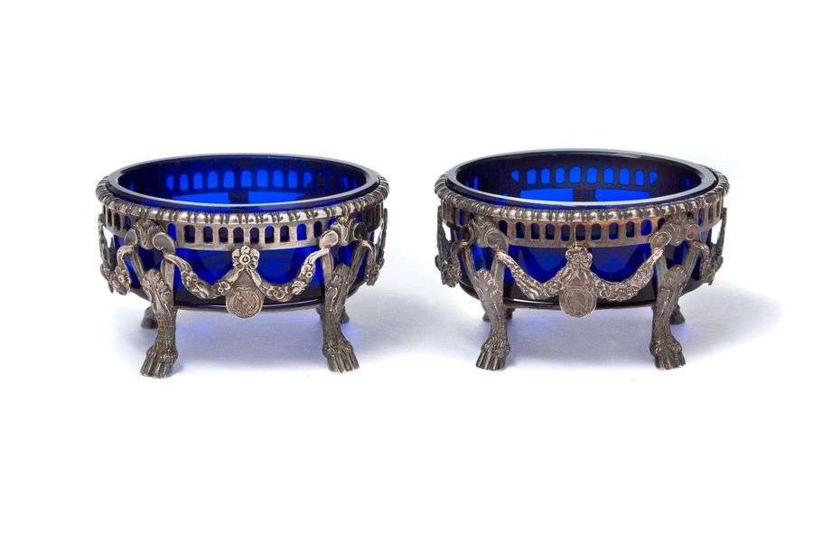 Paire de salerons à monture ajourée en argent (950) repoussé à décor de guirlandes de fleurs. Piètement quadripode à pattes de boucs. Fond oval de cristal bleu.