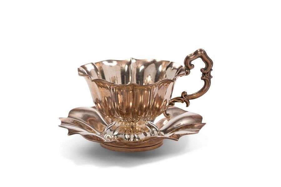 Saucière et sa soucoupe en argent de forme godronnée. Prise en forme d'agrafes