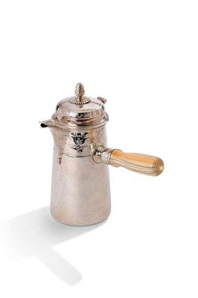 Petite chocolatière argent à décor ciselé et gravé d'un décor feuillagé. Manche en ivoire. Le couvercle est centré d'une prise en forme de pomme de pin