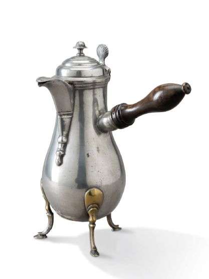VERSEUSE en étain ciselé de forme balustre reposant sur un piètement tripode en laiton. Bec verseur mouluré et anse latérale d'origine en bois tourné. Couvercle mouluré à poucier coquille et couvercle surmonté d'un frétel en forme de graine.