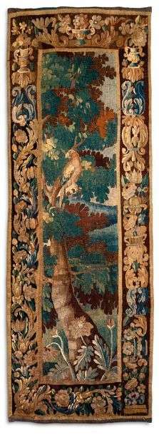 Deux lais de tapisserie représentant sur l'un un motif de verdure dans un une riche bordure feuillagée, sur l'autre un bouquet de fleurs et une chute de fruits.