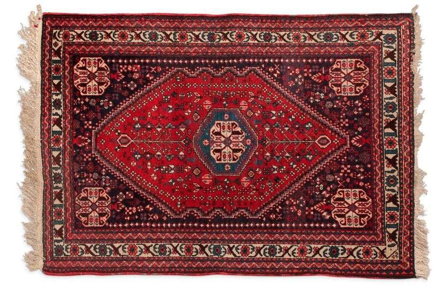 Champ rouge rubis à petits motifs de Fleurs en branchages stylisés géométriquement orné d un médaillon central floral incrusté d une tarentule géométrique en Forme De diamant