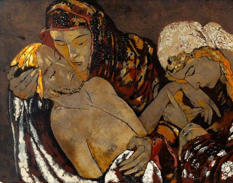 Cette Descente de croix s’inspire d’un sujet issu d’une longue tradition iconographique occidentale, dont les dorures reflètent l’influence de l’Art Déco dans l’oeuvre d’Alix Aymé. Le choix de ce sujet religieux la rapproche aussi des nabis par son caractère symbolique. On y reconnaît les traits fins employés par l’artiste qui, dans cette composition moderne, attire l’attention du spectateur sur les visages et l’entrelacement des mains. La richesse des détails de cette oeuvre et ces inspirations multiples font de cette oeuvre le lieu de rencontre entre deux cultures.