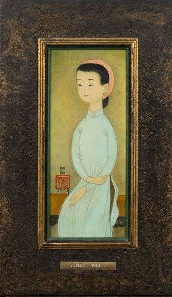 Cette petite oeuvre sur soie laisse transparaître la délicatesse du style de Mai Thu, qui souligne la finesse de la silhouette de cette jeune fille souriante. Les lignes affirmées à l’encre noire viennent cerner les tons subtils et fluides des aplats de couleurs, les faisant ainsi contraster avec le fond neutre de la composition. Au travers de ce portrait, l’artiste nous illustre une vision de l’esthétique traditionnelle vietnamienne de la féminité pleine de tendresse.