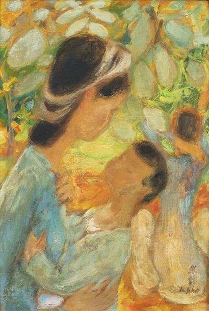 Progressivement, Le Pho s’intéresse à l’huile sur toile qui devient une alternative au travail sur soie, plus long et plus délicat. Cette évolution lui permet une création plus gestuelle et immédiate, ainsi qu’une densité chromatique plus variée. Maternité n°248 est très clairement révélatrice d’un apport impressionniste et nabis à l’oeuvre de Le Pho. Sa touche alerte et rythmée, et la luminosité qu’il a su insuffler à cette oeuvre sont très représentatives.