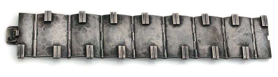 Large bracelet moderniste, argent martelé (<800). Signé, poinçon de maître non lisible