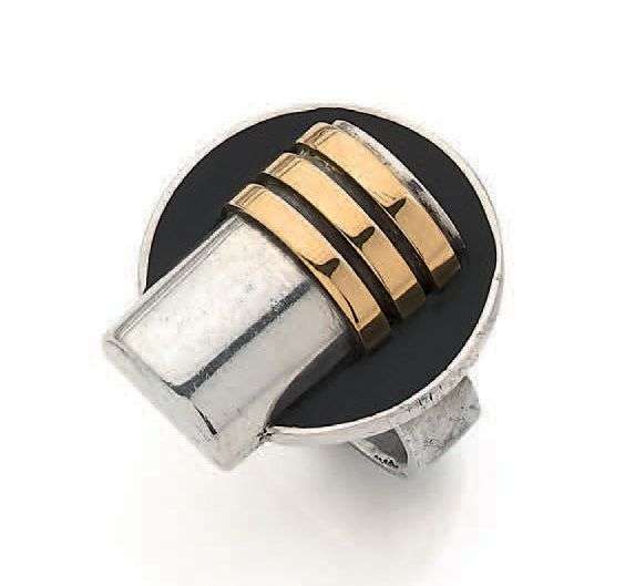 Bague "moderniste" Email noir, argent (<800) et or 18k (750). Poinçon de maître. Td.: 53 - Pb.: 17.8 gr. Une caution est nécessaire pour pouvoir enchérir sur ce lot.