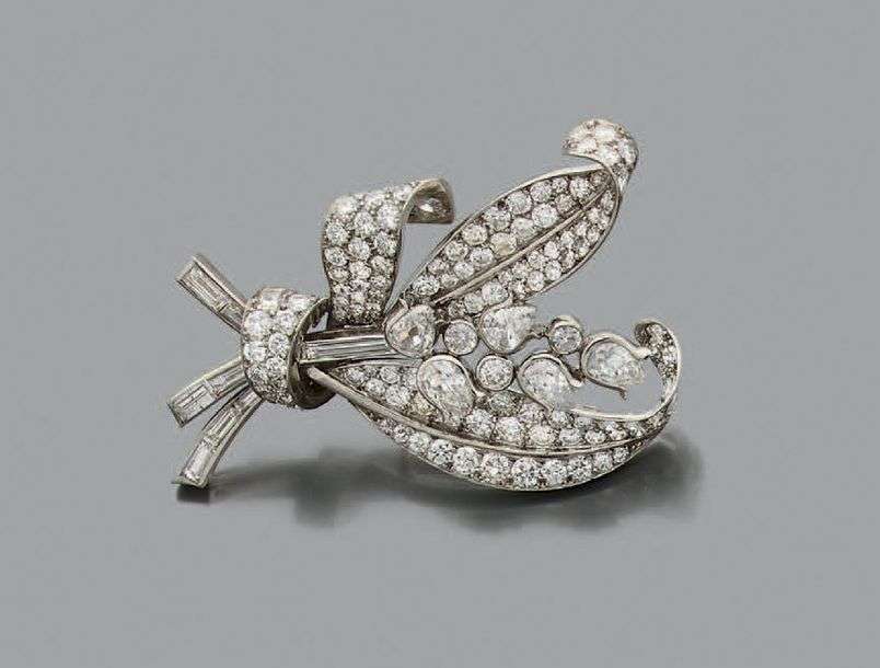 Diamants ronds, poires et baguettes, platine (950) et or 18k (750). Poinçon de maitre Charles Holl ayant beaucoup travaillé pour la maison Cartier. Numéroté